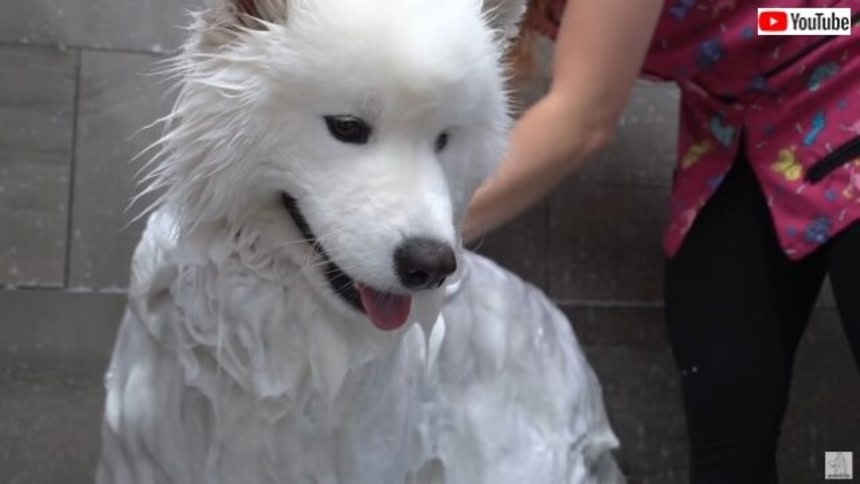 今日のお客さんは2歳のサモエド、ハーパーくんだ。まず最初はシャンプーからだよ。どこが絡まっているかとか、犬の前身のコンディションを見極めるにも大切なステップなんだそうだ。