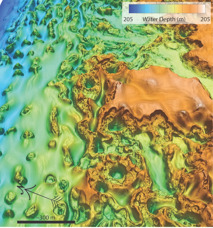 海底に、6階建ての建物の敷地ほどもある深い「シンクホール(陥没穴)」が形成されたり、内部に氷が詰まった丘のような地形(ピンゴ)が隆起したりしているのだ。