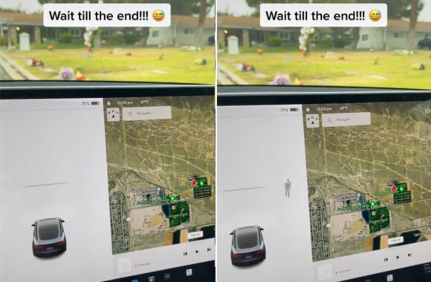 テスラの車で墓地の敷地をゆっくり走行していたら、周囲は無人にもかかわらず車載ディスプレイにいきなり人のマークが!