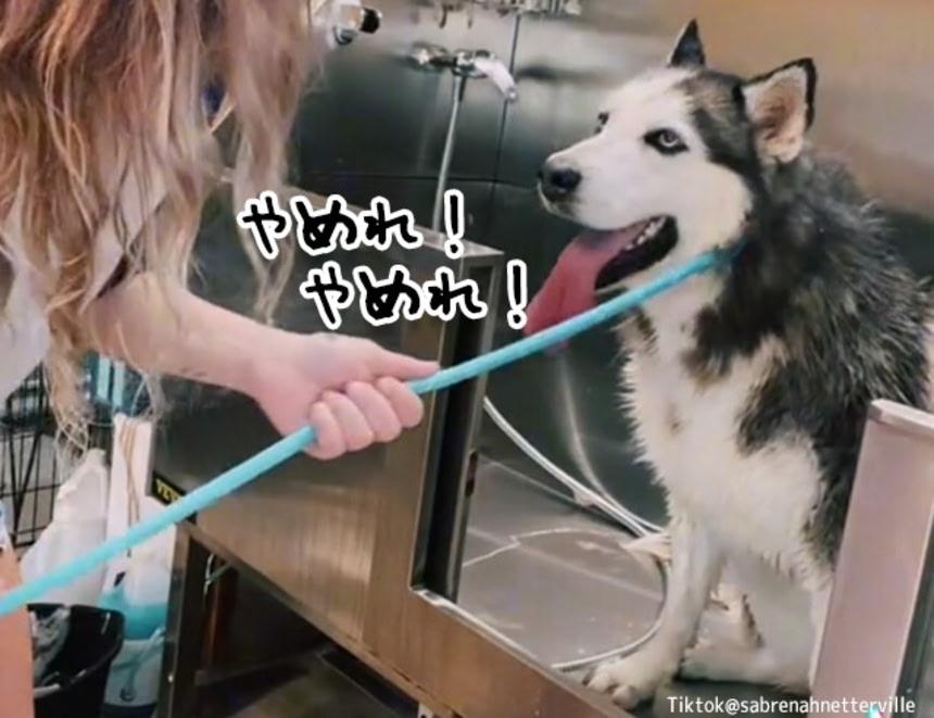この画像を大きなサイズで見るペットサロンを訪れたシベリアンハスキーのアキタ(AKITA)は、水浴びが相当気持ちよかったようで、トリマーがそこから連れ出そうとするも動こうとしない。