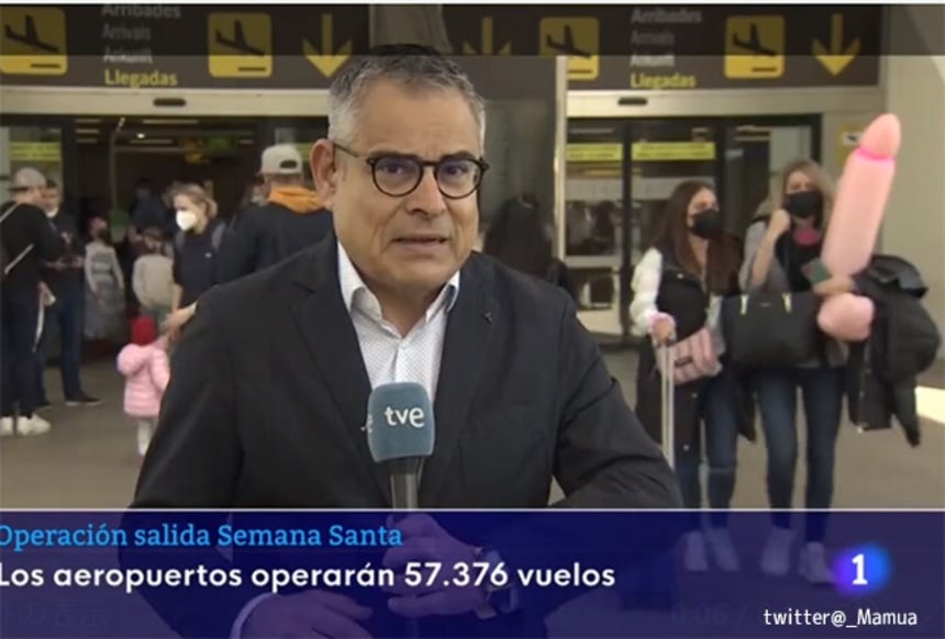 この画像を大きなサイズで見るスペインでまじめなニュース番組の生放送中に、予期せぬ放送事故が起きた。空港から出てきた女性が抱きかかえていたそれは、ピンク色の巨大な棒状のもの。