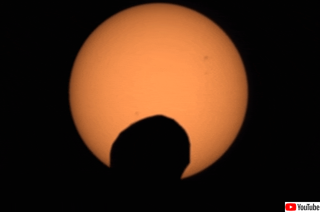 Mastcam-Zカメラは、サングラスのようなフィルターで強烈な日光を抑えつつ、歪なフォボスの形状や太陽の黒点までくっきりと捉えている。