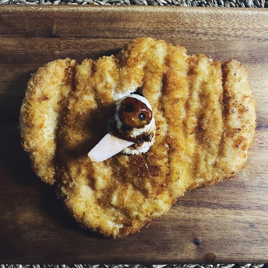 作り方は、むね肉1枚を観音開きにして揚げたものに穴を開け、茹でたむね肉を詰め鼻っぽく切ったチーズを乗っけてウスターソースを塗り、舌の形に切った魚肉ソーセージを取り付けて完成。
