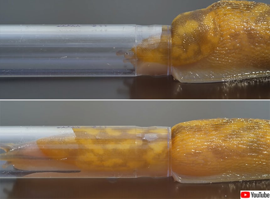 最初は筒の直径よりナメクジの直径の方が大きいのだが、柔軟な体をぎゅっと絞って中に突入だ。だが驚くのはここからだ。すごく…伸びるんです…