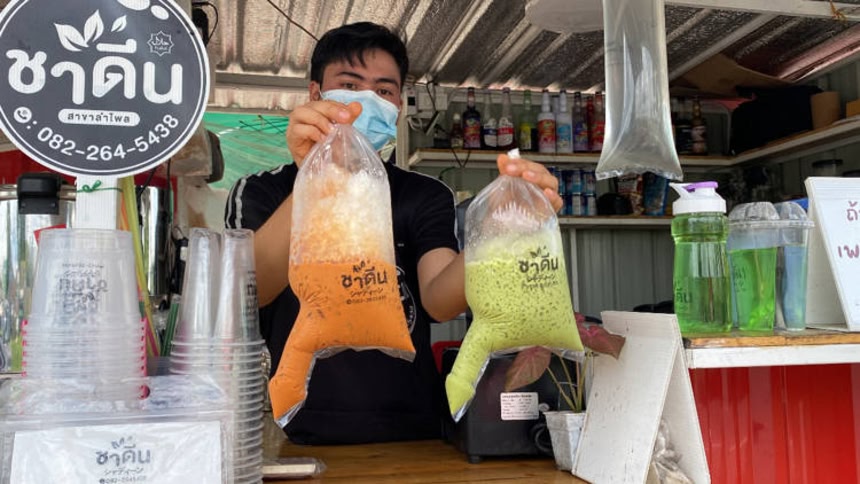 タイでは屋台で飲み物をテイクアウトする時、カップではなく、ビニール袋に入れられることが多い。そこでマデンさんはこのビニール袋に一工夫くわえることで、一気に話題となっている。