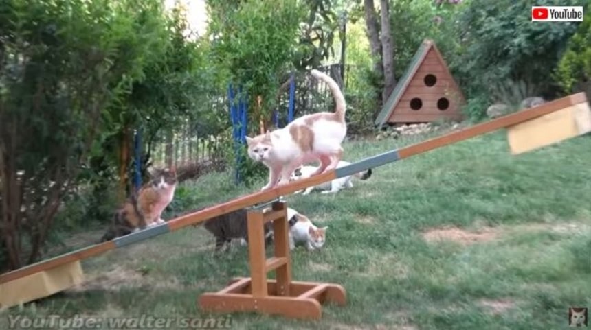 この同じシーソーを、こちらの邸宅の家猫たちが、一足先に体験していたようなんだ。サンティ、インディ、チューイーの3匹の家猫たちの反応は、こちらの動画でぜひ楽しんでね!