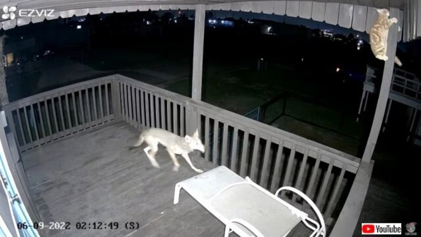 防犯カメラがとらえたのは、激しく戦うコヨーテと猫の姿だったのだ!