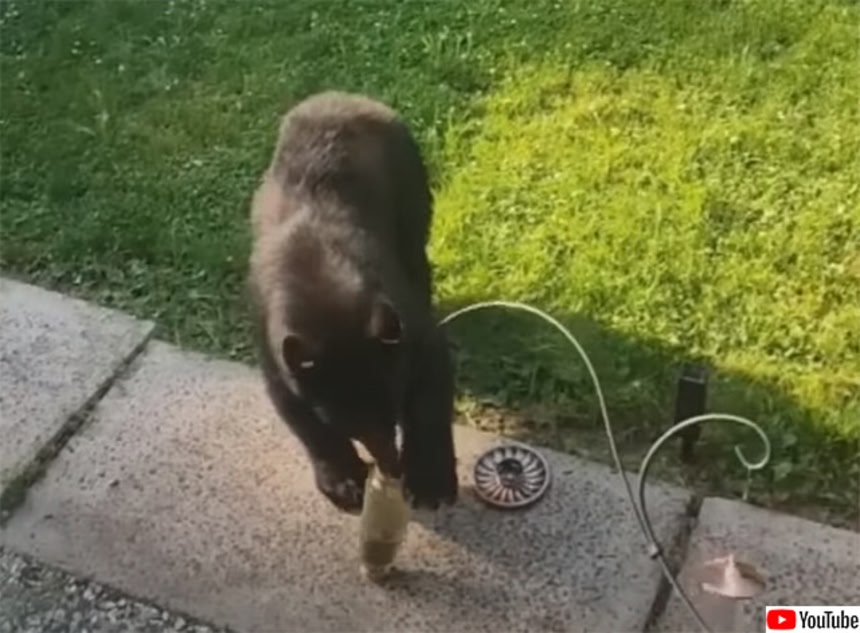 6月のある日、窓の外で奇妙な音がしたのでのぞいてみると、クマの子供が庭に設置したバードフィーダー(鳥用給餌器)を漁っているのを目撃。