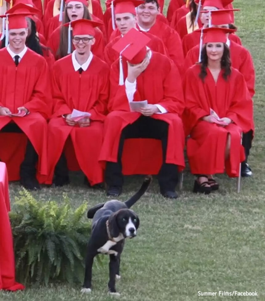 普段から学校の敷地内に出入りし、生徒たちに知られていたチャーリーは、自分にも卒業式に出席する権利があるとばかりに、一番目立つ場所で参加し、卒業生らに学校最後の笑顔をもたらしたようだ。