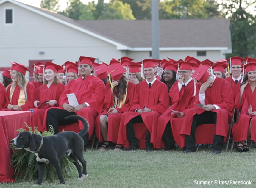 この犬は、卒業生の1人、ローガン・ブランチさんの愛犬、チャーリーだ。チャーリーは、ローガンさんが通学している間、敷地内に入り込んではローガンさんや友達に会いに来ていたという。