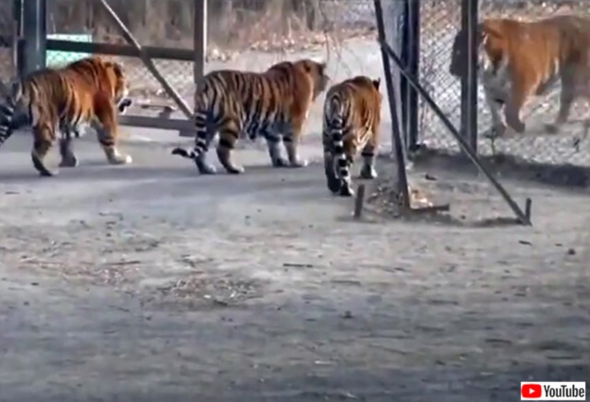 この画像を大きなサイズで見る囲いの中に数匹の虎がいたのだが、柵の外から体が一回り大きい虎が入って来た。その時の虎たちの対応が人間社会でもよく見る構図となっていた。