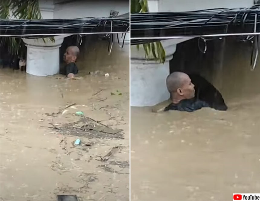 深刻な水害の恐れから住民が高台を目指して避難する中、ある男性が深さ1.8メートルもある水の中に飛び込んだ。
