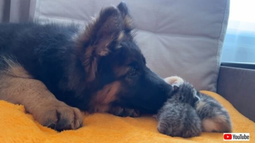 この画像を大きなサイズで見るふわもこ子猫ズの山…というかカタマリを初めて目にしたジャーマンシェパードの子犬が、興味津々でそのカタマリに鼻先を突っ込んでみた結果、子猫たちの