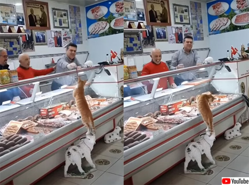 事実猫は、その置物に登って赤い色の服を着た真ん中にいる店員の1人から肉の端切れを分けてもらう。