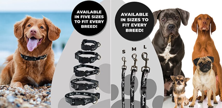 ラインナップは、リードと首輪のカラーバージョンとモノクロバージョンの2種。首輪のサイズはどの大きさの犬にも適応できるように5つのサイズが用意されている。リードも3種類から選択可能だ。
