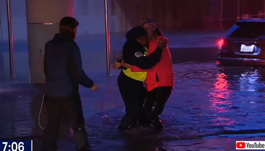『FOX Weather』のテレビクルーは、ダラス・フォートワース複合都市圏の集中豪雨による鉄砲水による被害の激しかった道路で現場中継を行おうと準備をしていたところ、水に飲み込まれていく車を目撃。
