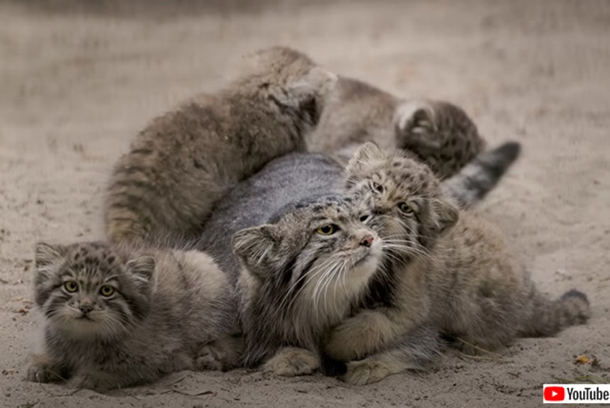 ノボシビルスク動物園で暮らすマヌルネコのミアは6歳で初出産、初めての子育てに奮闘中だ。生後2か月になった4匹の子猫たちはお母さんにぺっとりぴっとりと磁石のようにくっついている。