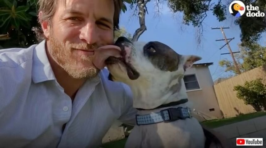 ピットブルのバンバンは、元の飼い主の手でシェルターに引き渡され、安楽死の恐怖に震えていた。その後幸運にも、バンバンはロサンゼルスのシェルターから、保護団体を介してオレゴンの新しい飼い主に引き取られた。