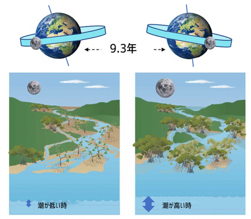 その結果、月と林冠の面積との意外な関係性が明らかになったという。月の軌道の長期的なゆらぎが、マングローブの成長に影響していたのだ。