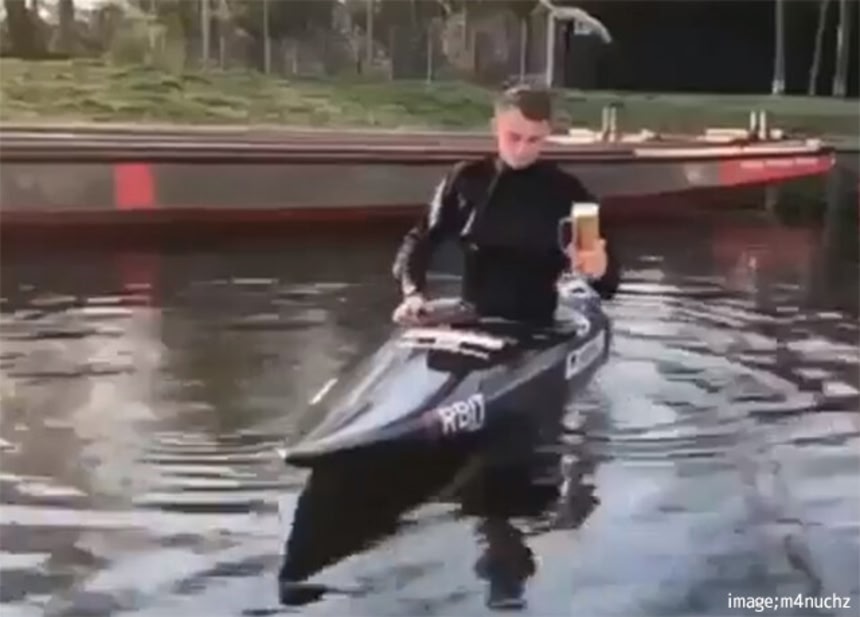 グラス1杯のビールを手に持ち、ボートに乗った男性。男性は故意にボートを転倒させ、ビールをこぼさずに起き上がるというテクニックを披露する。