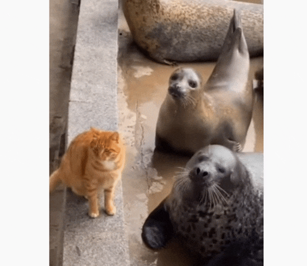 猫は、我先にと魚を食べる気満々だ。ところが先にアザラシがキャッチして食べた。猫はそれが気に入らないようで、餌をもらったアザラシの顔面に猫パンチの制裁。