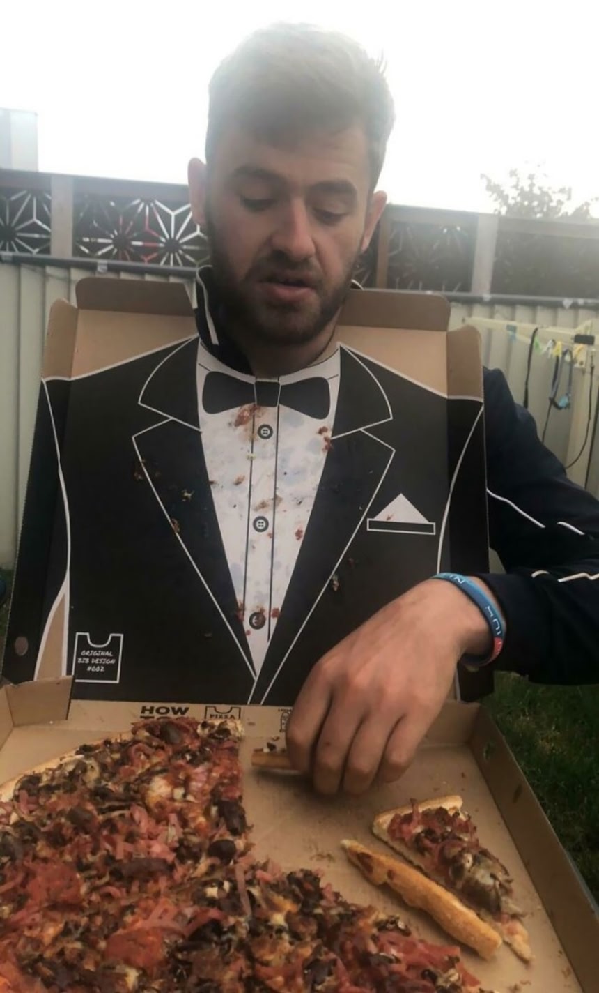 これで遠慮なくピザが食べれる?こちらのピザはボックスの蓋がエプロン代わりになる仕様。その代わりせっかくのタキシードが汚れちゃうけどな…