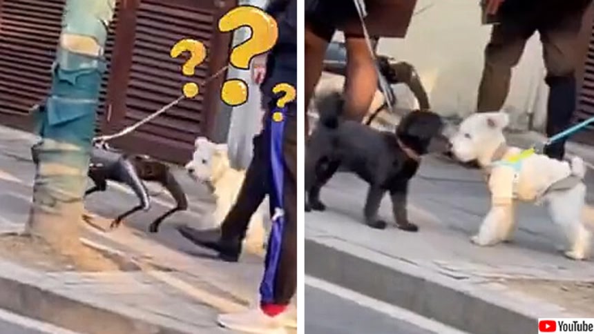 リアルな犬も混乱!中国で流行のロボット犬のお散歩シーン