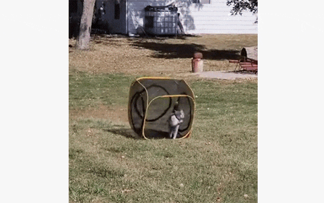 飼い主が猫がくつろぐためにAmazonで買った、メッシュ素材のキューブ状の中に入って、転がしながら歩くのだ。