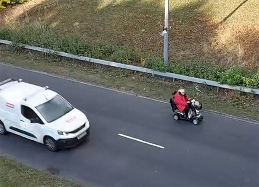 イギリスの法律では、実際にはおばあさんの乗っているシニアカーは、二車線道路を含む特定の道路を走行することが許可されているという。