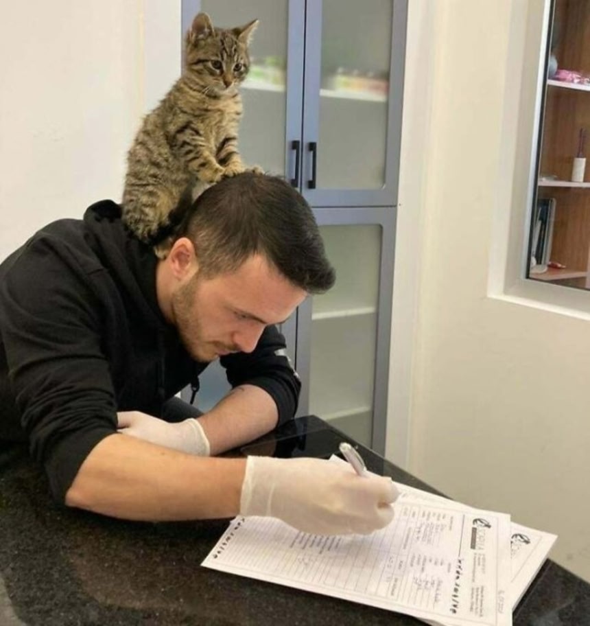 トルコの動物病院にて。望む望まないにかかわらず、猫の監督下で業務にあたるスタイルは獣医師会ではあるあるなのかもしれない