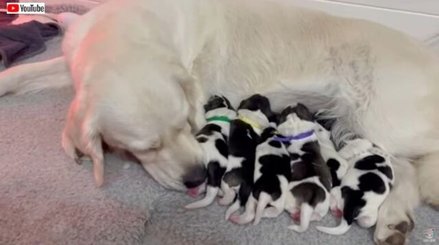 しかしこんなにたくさんの子供たちのお世話を、たったひとりでするのは想像を絶する重労働。そこでご主人たちは考えた。自分の子供たちに手がかからなくなってきたゴールデンレトリバーのブルックリンさんに、ちょっとノヴァさんを手伝ってもらえないだろうか。