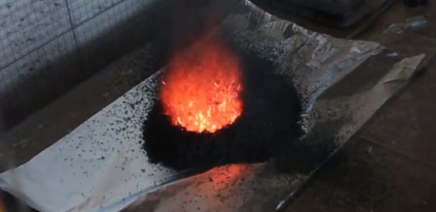 この実験は教師の監視のもと、「蛇玉(へびだま)」を作るというもの。蛇玉は海外でカーボンシュガースネークと呼ばれており、火薬は使用せず、砂糖と重曹、アルコールを混ぜて混合物を作る。