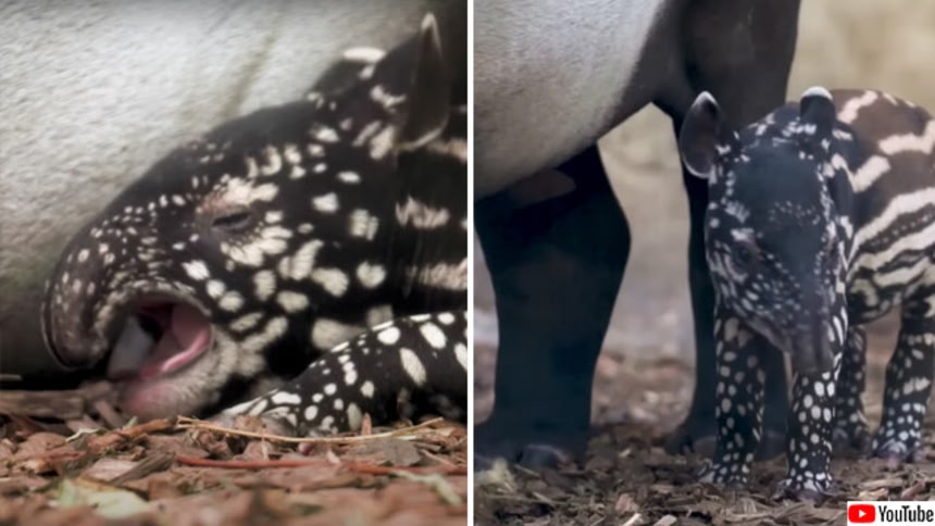 小さな斑点と縞模様があるマレーバクの赤ちゃんの愛らしい足音をまた聞けてうれしいです。