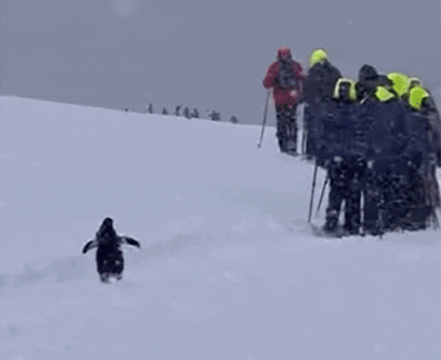 南極探検ツアーを行っていた人間たちを見かけたペンギンは、好奇心旺盛な冒険家タイプのようで、群れから抜け出し、人間たちの後をついていった。