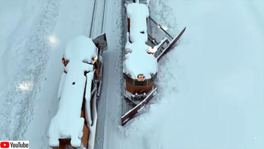 そんな時に活躍するのがパワフルな除雪列車だ。アメリカ、カリフォルニア州タホ湖の一部で大雪が降った後、除雪列車が雪をかき分けながら走っている様子をドローン撮影した映像が公開されていた。