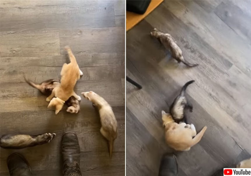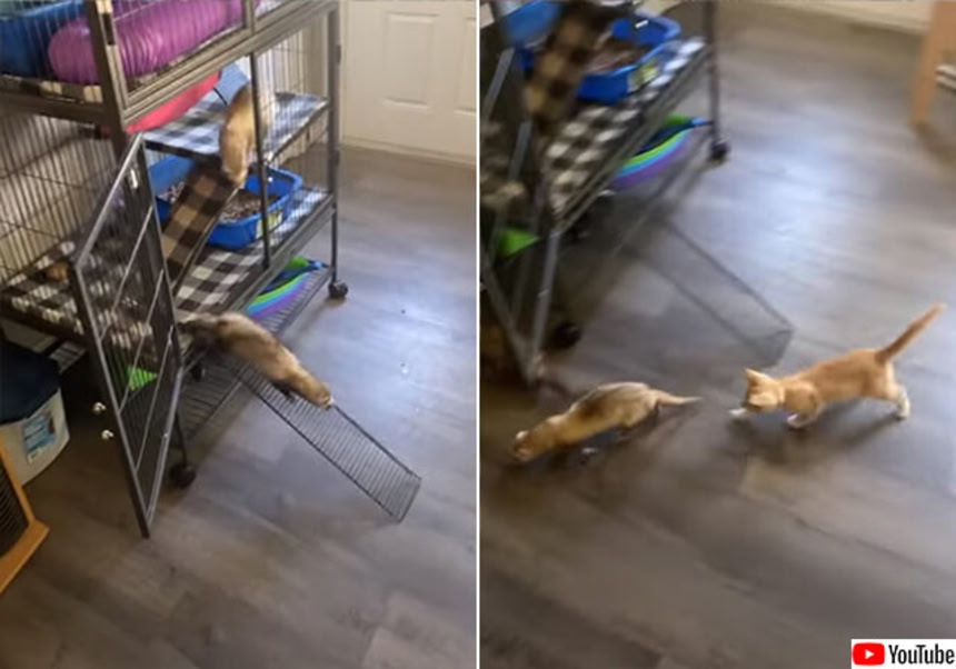 子猫はフェレットたちと遊びたくてたまらない。飼い主がケージを開けて、フェレットを外にだすやいなや、待ってましたとばかりに近づいてきた。