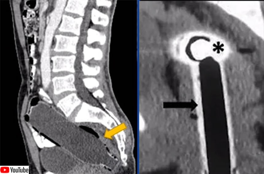 X線で捉えられた男性の直腸には、長さ20cm、幅5cmもの大きな砲弾が入り込んでいた。