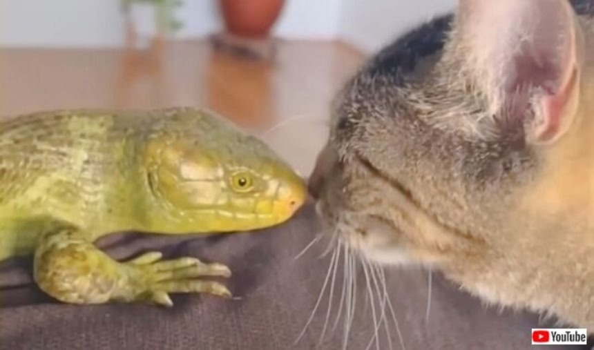 トカゲと猫なんてすごい組み合わせ…しかも猫側の愛が強めっていう