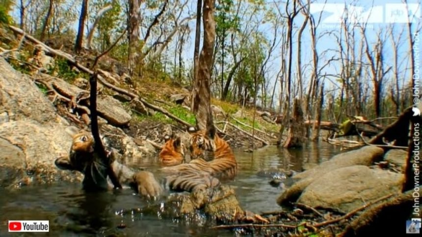 この画像を大きなサイズで見るスパイカメラのいいところは、彼らの日常の何気ない姿を垣間見られることだ。猿のあげた警戒の声に反応する子虎たち。近くに捕食者がいるのかも?
