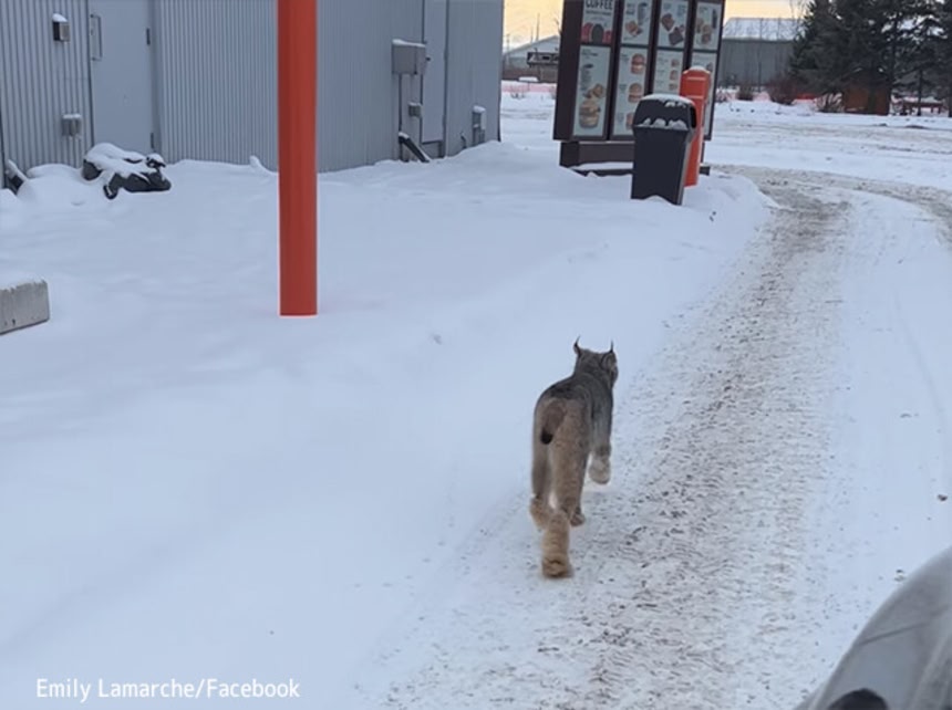 どう見ても車じゃないし、人でもない。野生のカナダオオヤマネコだ。散歩がてらにファストフードでも食べようと思ったのかもしれないし、そうでもないのかもしれない。