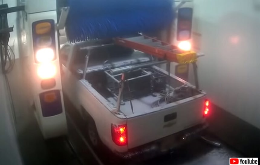 荷台にはしごを積んだままの状態で、自動洗車機でトラックを洗おうとした時の映像が公開されていた。