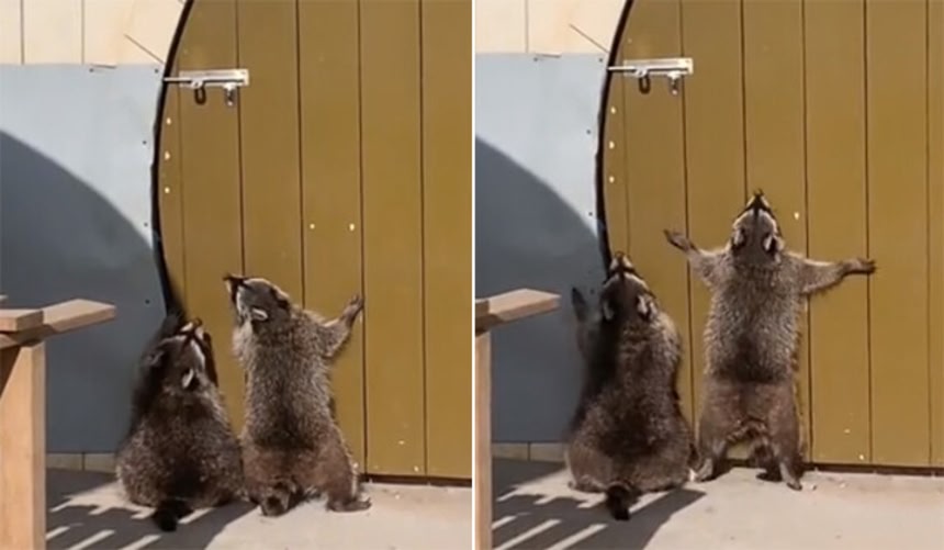 動物園で飼育されている2匹のアライグマは、丸い形をしたドアをなんとしてでも開けたかった。アライグマたちは、かんぬき(扉を閉める為の金属の棒)をスライドさせれば開けられることを知っていた。