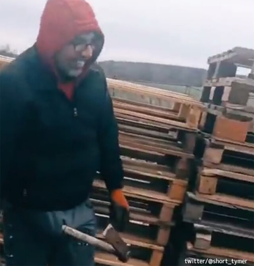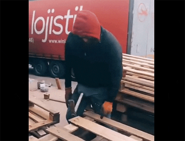 自らの金づちではなく、実際の金づちを股間に仕込み、トントンとくぎを打ち始めた職人さん。