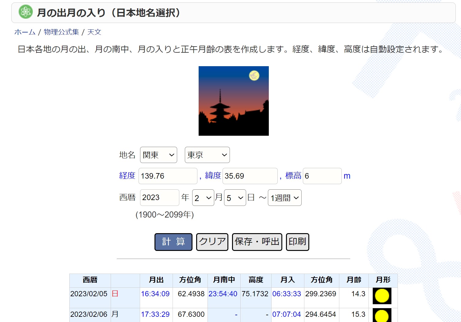 なお、地域によって月の出入りの時間が若干異なるので、以下のサイトで地名と日時を選択して「計算」を押すと確認することができる。