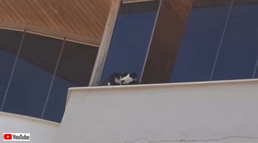 街の中を歩いていると、猫の鳴き声が聞こえてくる。見上げると、7階建てのビルの上に1匹の猫が!