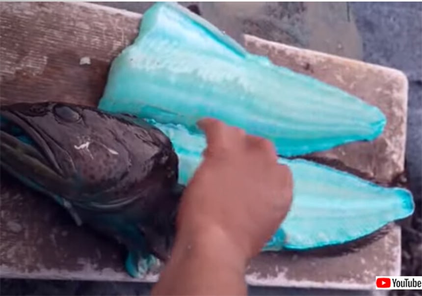 その多くは、茶色や灰色を帯びていて、身の色は普通の白身魚と同様なのだが、5匹に1匹の割合で、体は茶色っぽいが口の中と身が青色のものや、体全体が青っぽい色をした個体がいるという。