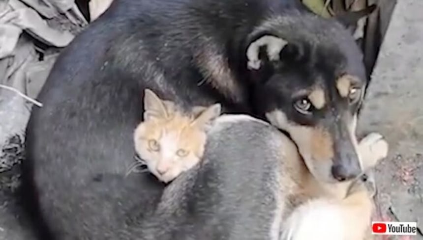 身を寄せ合う犬と猫を見て涙出る 寒いし心細いんだろうなぁ・・(´;ω;`)
