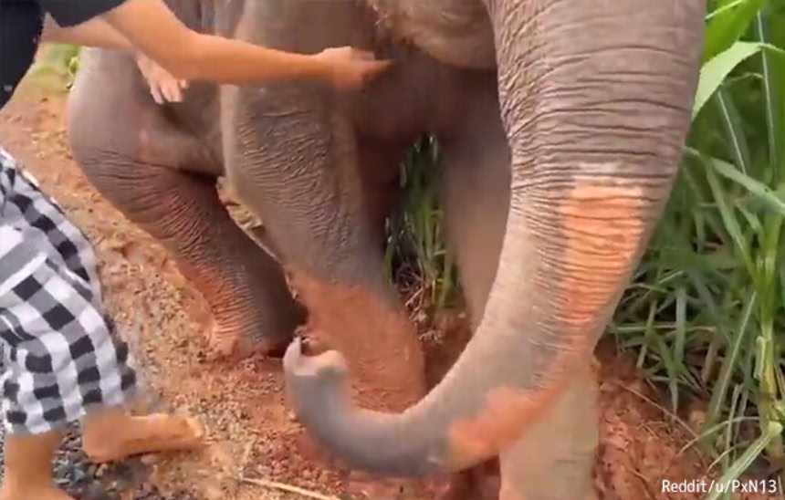 ぬかるみにはまった子象を助ける少女