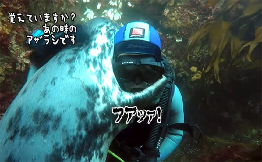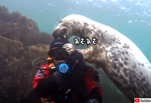 特に狙われやすいのはフィンや手袋、エアホースなどや、輝いて見えるものなんだそうで、そいえばかつてダイバーのフードやマスクを外そうとしていたアシカもいたっけね。