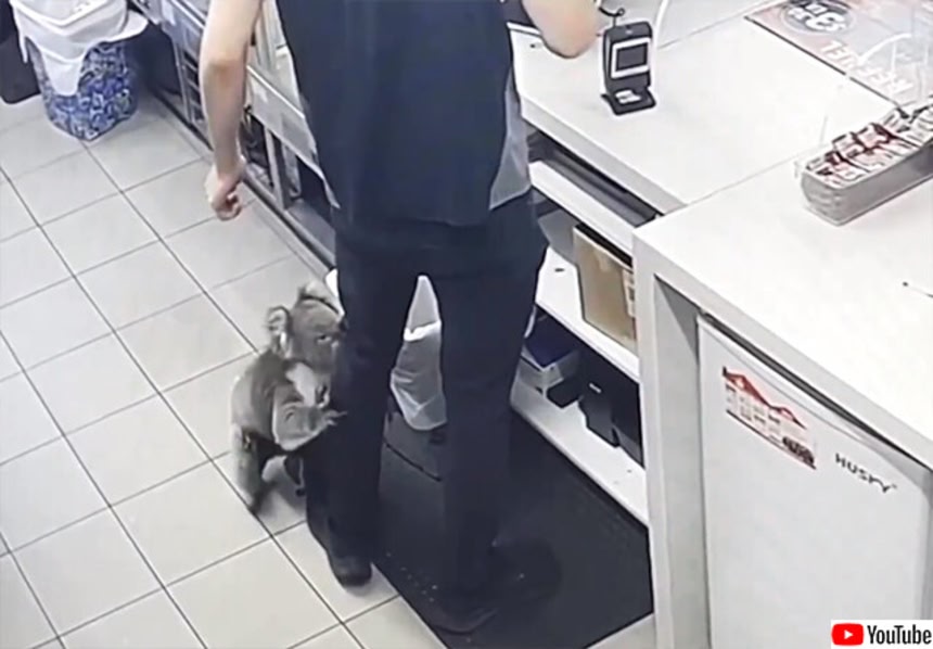 コンビニに来店したコアラ、お目当てはお兄さんの脚?
